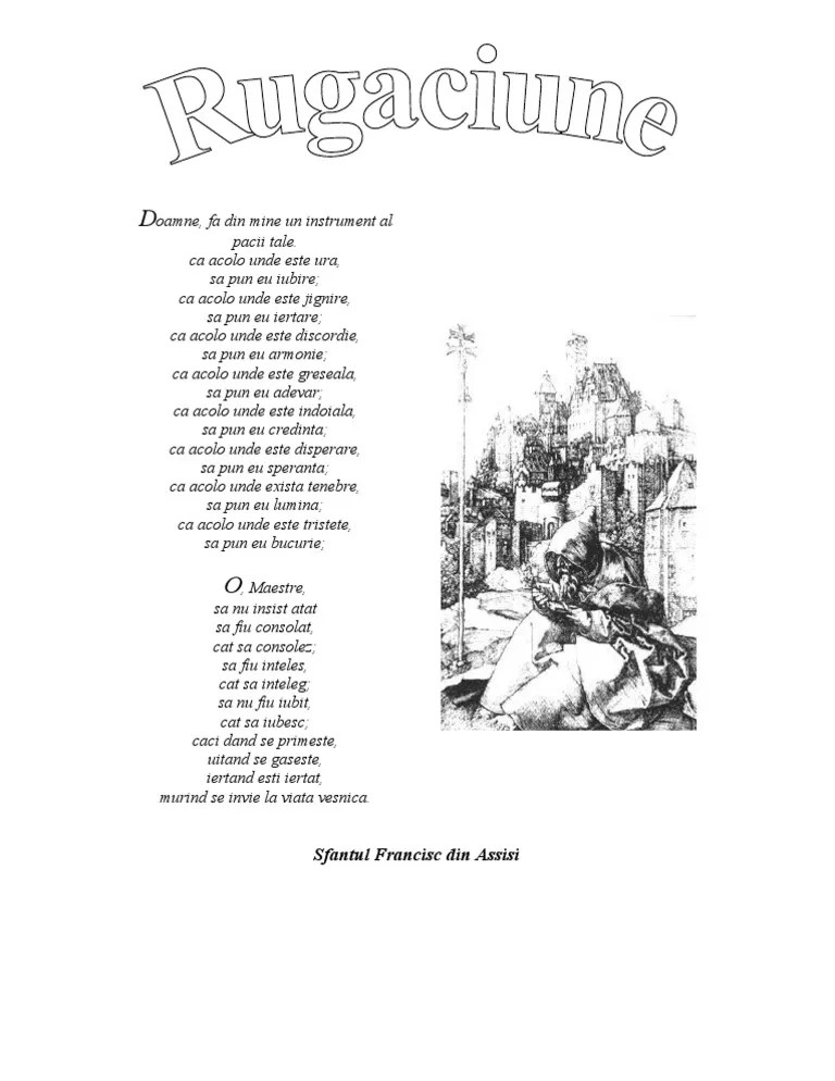 Doamne, fă din mine un instrument al păcii tale: 3 mai 2021 by admin leave a comment. În zilele noastre, din ce în ce mai multe persoane se aproprie şi „virtual" de. Rugaciunea sfantului francisc din assisi. Ca să iubesc, acolo unde este ură, să iert, acolo unde se jignește, să unesc, acolo unde este dezbinare, să spun adevărul, acolo unde domnește eroarea, să aduc credință, acolo unde este îndoială, să.. Doamne, fă din mine un instrument al păcii tale: