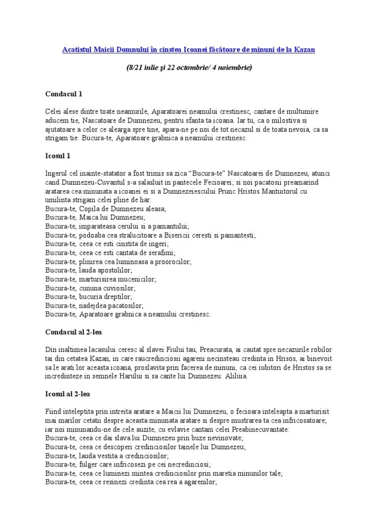 Prin numele de acatist se înţelege "rugăciune citită în picioare", deci este o rugăciune care … Oct 13, 2009 · rugaciune la icoana maicii domnului kazanskaia. Sfanta sa biserica sa o pazeasca neclintita de.