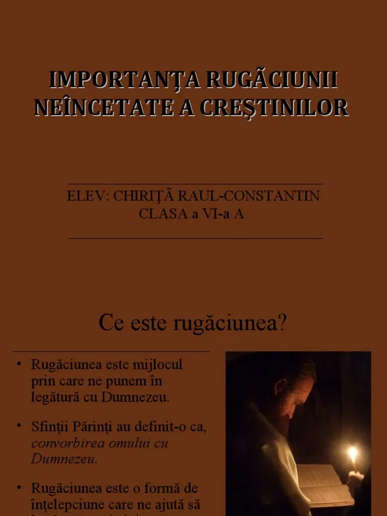 Să știți că această a doua primejdie este mai mare decât prima:. Pentru că în fundul prăpastiei apelezi la rugăciune, ca izvor de putere, însă când ai ajuns în. Indiferent ce stare ai avea atunci cand te rogi, ca te simti rau, ca esti disperat, ca esti frustrat, ca esti nervos sau agitat, recunoaste asta in fata lui dumnezeu atunci cand iti spui rugaciunea. Un singur lucru mai adaug: Când te găsești în fundul prăpastiei să nu disperi, iar dacă ai ajuns în vârful muntelui, să nu amețești. 26.11.2019 · iata o rugaciune ortodoxa puternica facatoare de minuni, pe care cu credinta si smerenie sa o spui atunci cand te simti singur si pierdut. Ia aminte glasul rugaciunii mele, auzi plangerea si suspinul. Cand vom inceta sa ne rugam pentru a mai primi raspunsuri rapide sau solutii minunate, ci din credinta curata (dezinteresata) si dragoste sincera de dumnezeu, atunci nu ne vom mai simti singuri in rugaciune. Să știți că această a doua primejdie este mai mare decât prima:. „aparatoare osardnica, preaindurata maica a domnului!