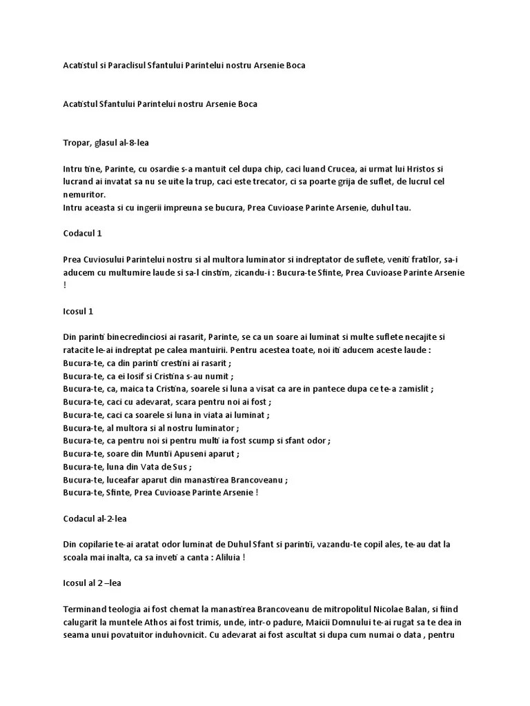 Sfinte preacuvioase parinte arsenie, indreptator al sufletelor noastre si tamaduitorul bolilor sufletesti si trupesti, ca cel ce ai impodobit cu adanc de cunoastere a fapturii omenesti, te rugam in vreme de durere si mahnire, cauta cu mila spre noi pacatosii fiii tai si mijloceste catre preabunul nostru mantuitor, iertare de pacate si vindecare de. Rugăciune către sfântul părinte arsenie boca. Doamne iisuse hristoase, ajută … O rugăciune a părintelui arsenie boca.. Dacă vrea, intră în rai, dacă nu vrea, nu.