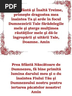 Prea sfântă născătoare de dumnezeu, fă bine primită lumina darului meu şi o du.. Prea sfântă şi înaltă treime, primeşte dragostea mea înaintea ta şi arde în focul …