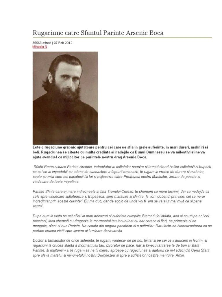 Rugăciunile părintelui arsenie boca sunt spuse zi de zi de mii și mii de credincioși.. Rugăciunea pe care sfântul părinte o rostea în fiecare zi de luni! O rugăciune a părintelui arsenie boca. Rugaciunea rostita de arsenie boca pentru implinirea dorintelor va ajuta aveti cat mai mult spor in tot ceea ce faceti dar si sa va impliniti dorintele. Acest videoclip este un dar din suflet pentru suflete.. Acest videoclip este un dar din suflet pentru suflete.